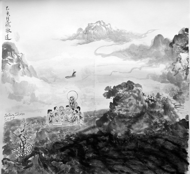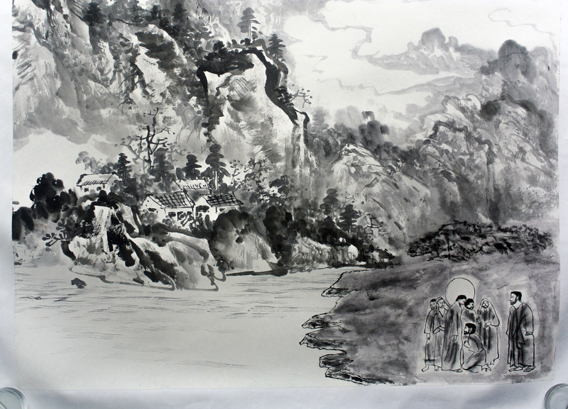 In seiner Malerei verbindet er fernöstliche Spiritualität mit christlichen Glaubensinhalten.